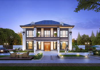 傳統(tǒng)與現(xiàn)代相結(jié)合,白墻黛瓦,鏤空窗套,總體布局上,利用傳統(tǒng)玄關(guān)手法處理入戶門,符合中國風(fēng)水常識。進(jìn)入院門后院內(nèi)空間開闊,東西廂房和主樓地位和層次分明,主樓采用基本對稱式設(shè)計(jì),對稱的兩邊戶型工整的守衛(wèi)在堂屋兩邊,凸顯堂屋在建筑當(dāng)中地位的重要性。