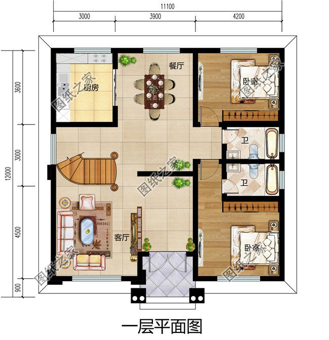一層戶型:客廳、餐廳、廚房、臥室(帶衛(wèi)生間)、臥室、衛(wèi)生間;