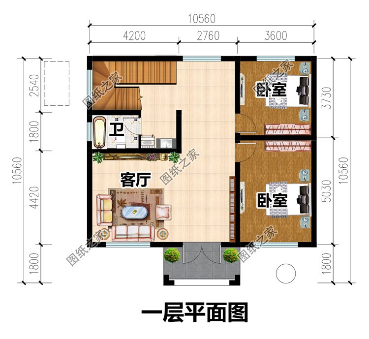 一層戶型:客廳、臥室x2、衛(wèi)生間;