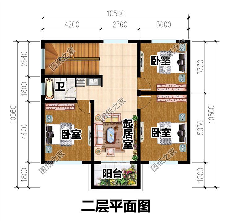 二層戶型:起居室、臥室x3、衛(wèi)生間、陽臺;