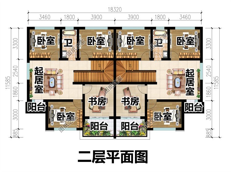 二層房屋戶(hù)型:起居室、臥室x3、書(shū)房、衛(wèi)生間、陽(yáng)臺(tái);