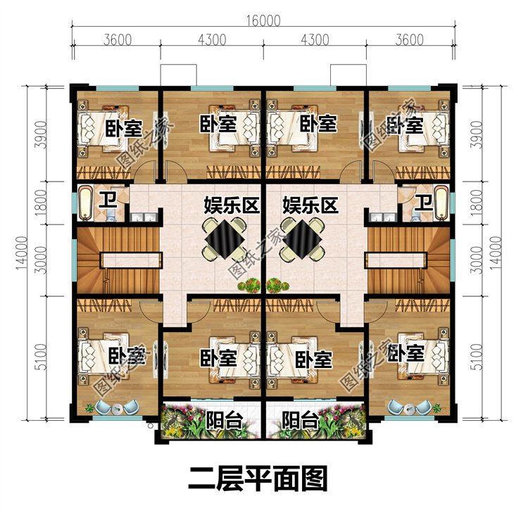 二層:娛樂室、臥室x4、衛(wèi)生間、陽臺;