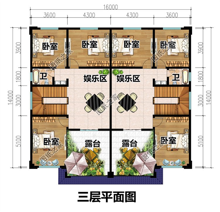 三層:娛樂室、臥室x3、衛(wèi)生間、露臺;