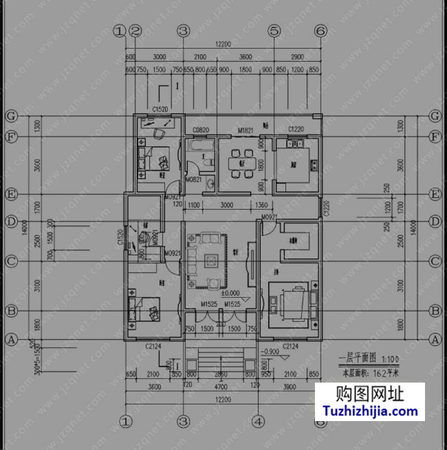 建筑總面積/總層高:162平米(不含入戶平臺(tái)、陽臺(tái)、露臺(tái))/總高6.5米,屋檐口高3.6米